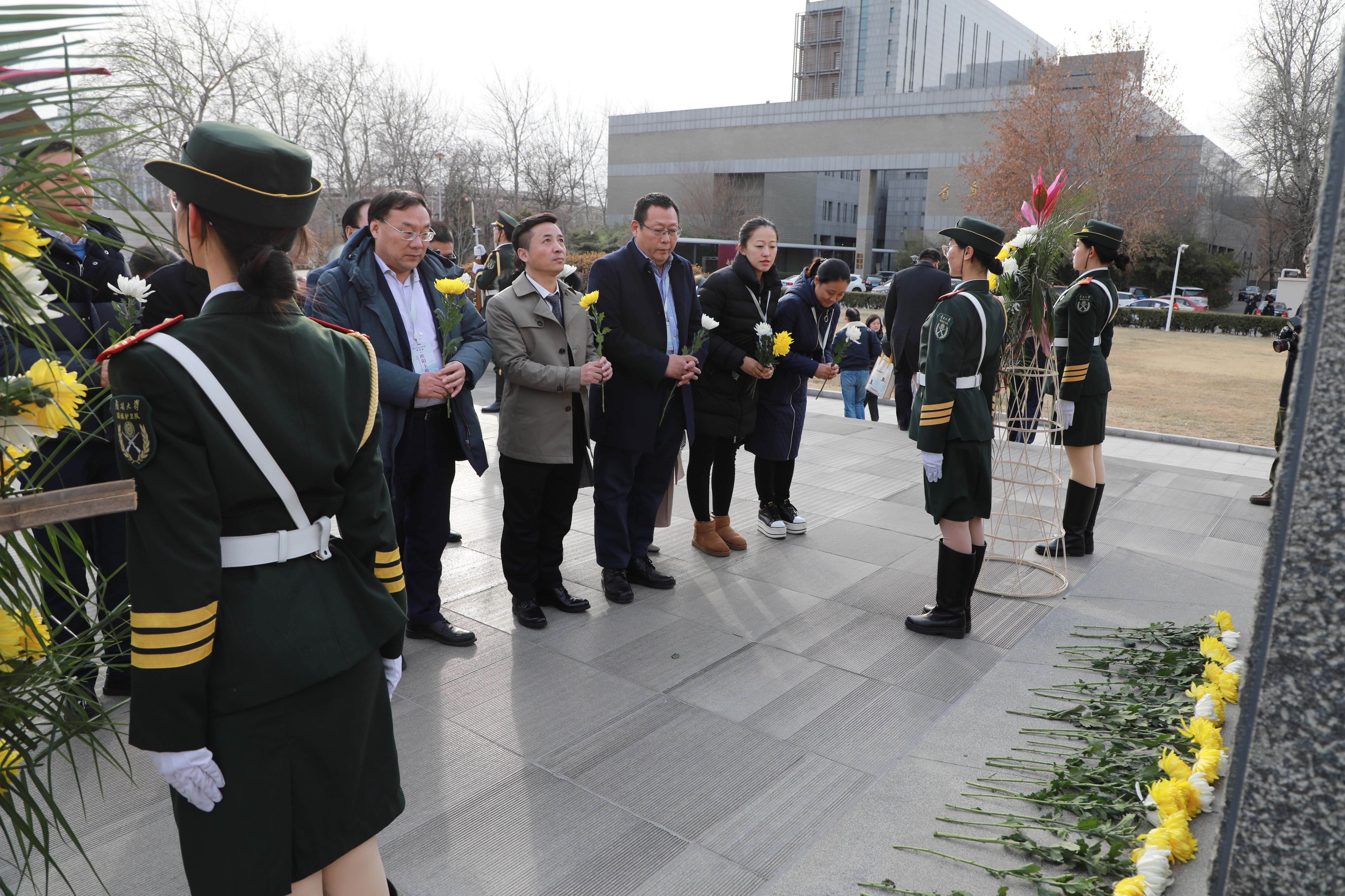 在庄严肃穆的气氛中,8名南开大学国旗护卫队队员护送着2只花篮,走向周恩来总理塑像。