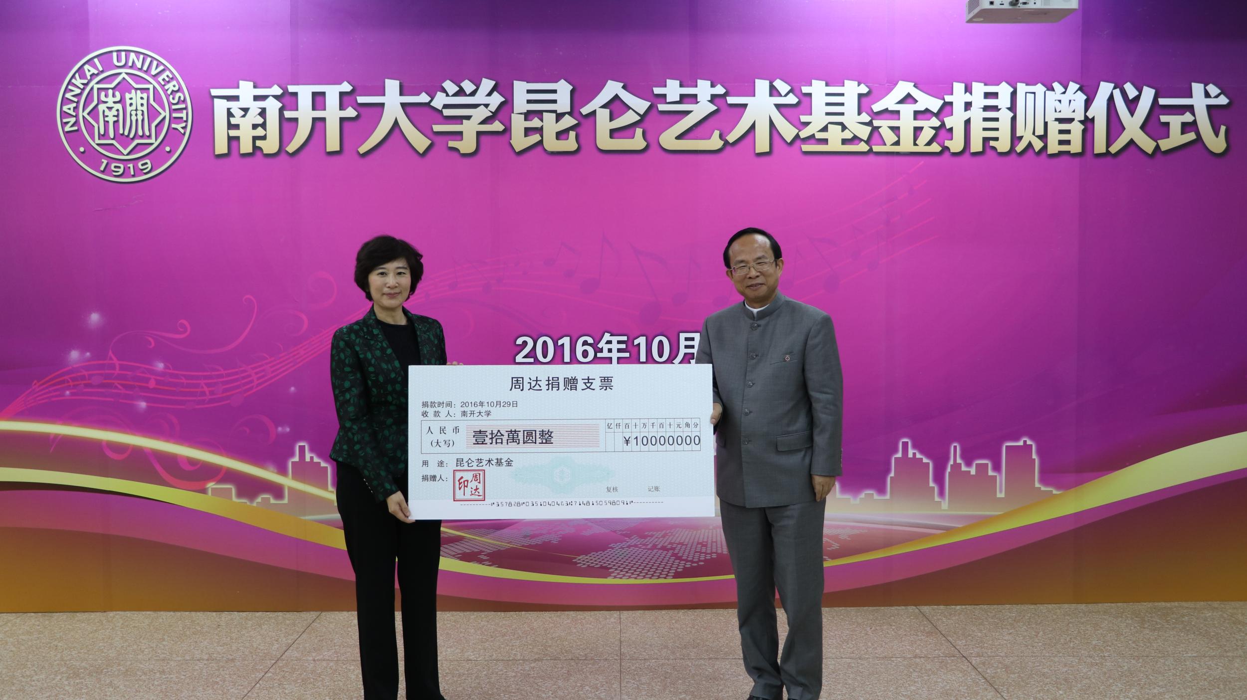 南开大学“昆仑艺术基金”由南开大学校友、南开大学深圳校友会会长周达于2015年捐资50万元设立,现再次捐资10万元用于支持南开大学学生合唱团的排练、演出及服装设备等费用。