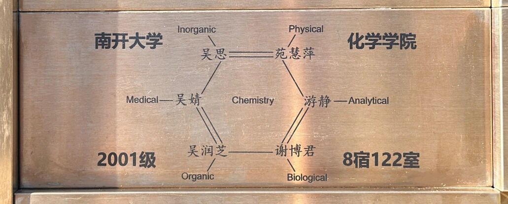更巧的是,当年她们在“我爱南开BBS”上,每个人都取了一个“XX化学”的ID,比如“有机化学”“分析化学”……于是,苯环上的六个碳原子位置,她们写上了各自的名字;而氢原子的位置,则对应着每个人的“化学称谓”。